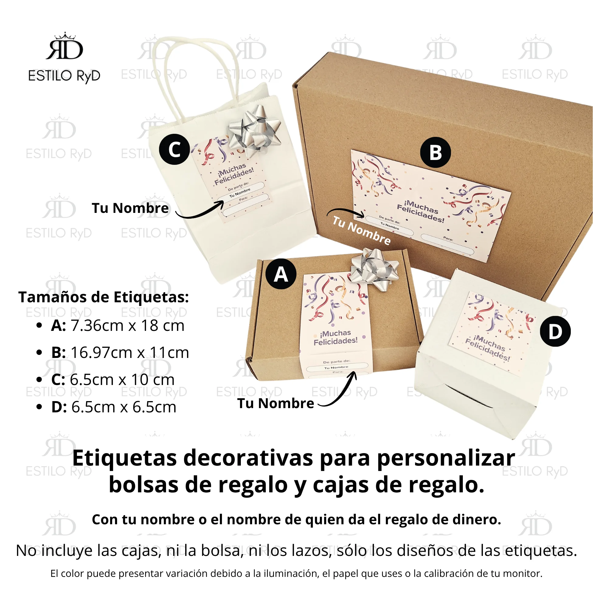 En el caso de las Etiquetas de bolsas y cajas, puedes imprimirlas en papel adhesivo 90gr o 135gr para tu tipo de impresora (Inyección de tinta o láser).