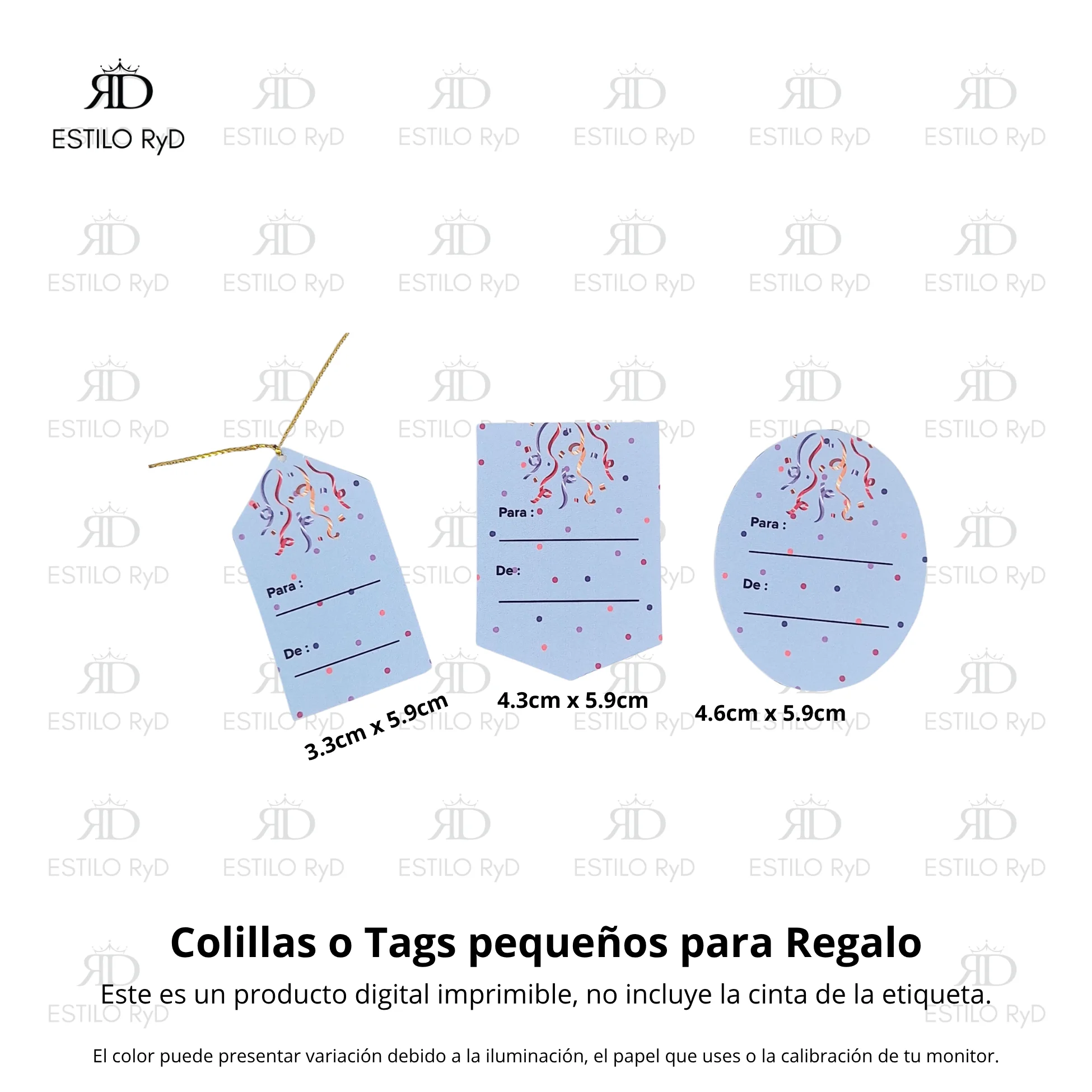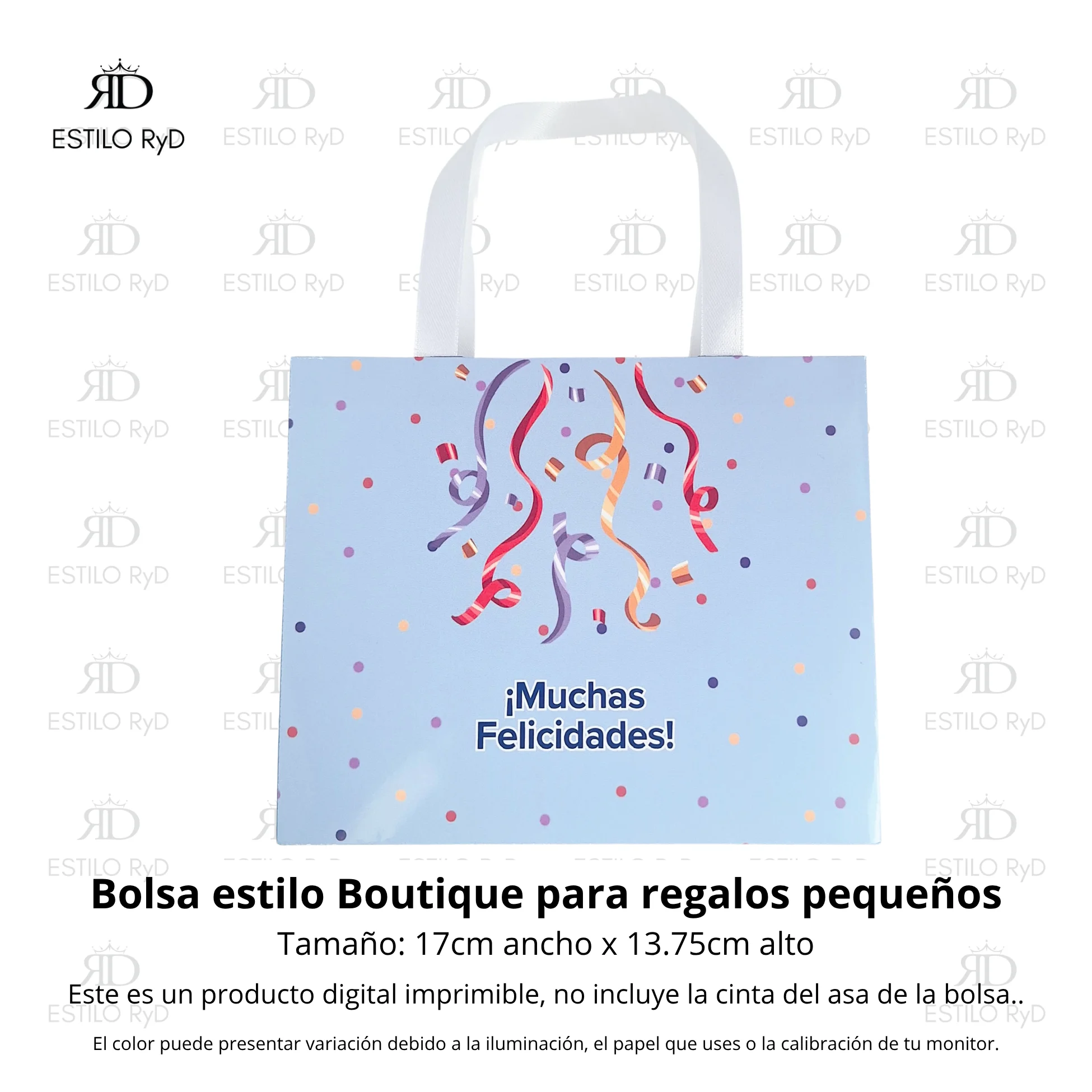 Necesitas imprimir los diseños que deseas del .pdf y para obtener el producto terminado vas a necesitar: tijeras / cutter / bisturí o exacto, goma / pegamento / cinta doble cara, cinta raso para las asas de las bolsitas y el hilo de preferencia para los Tags o Colillas para regalo.