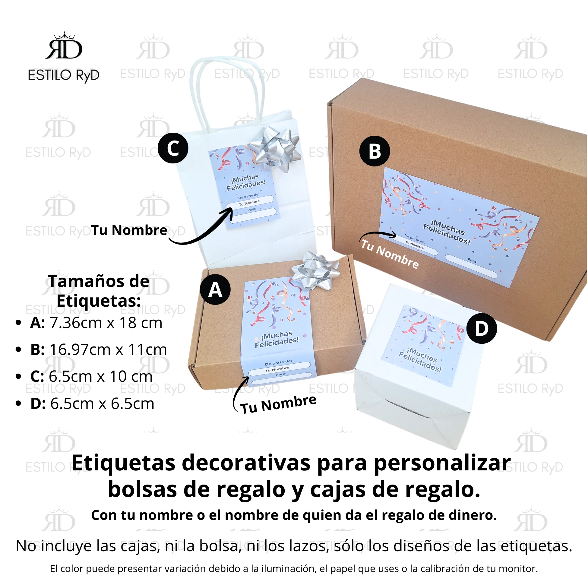 En el caso de las Etiquetas de bolsas y cajas, puedes imprimirlas en papel adhesivo 90gr o 135gr para tu tipo de impresora (Inyección de tinta o láser).