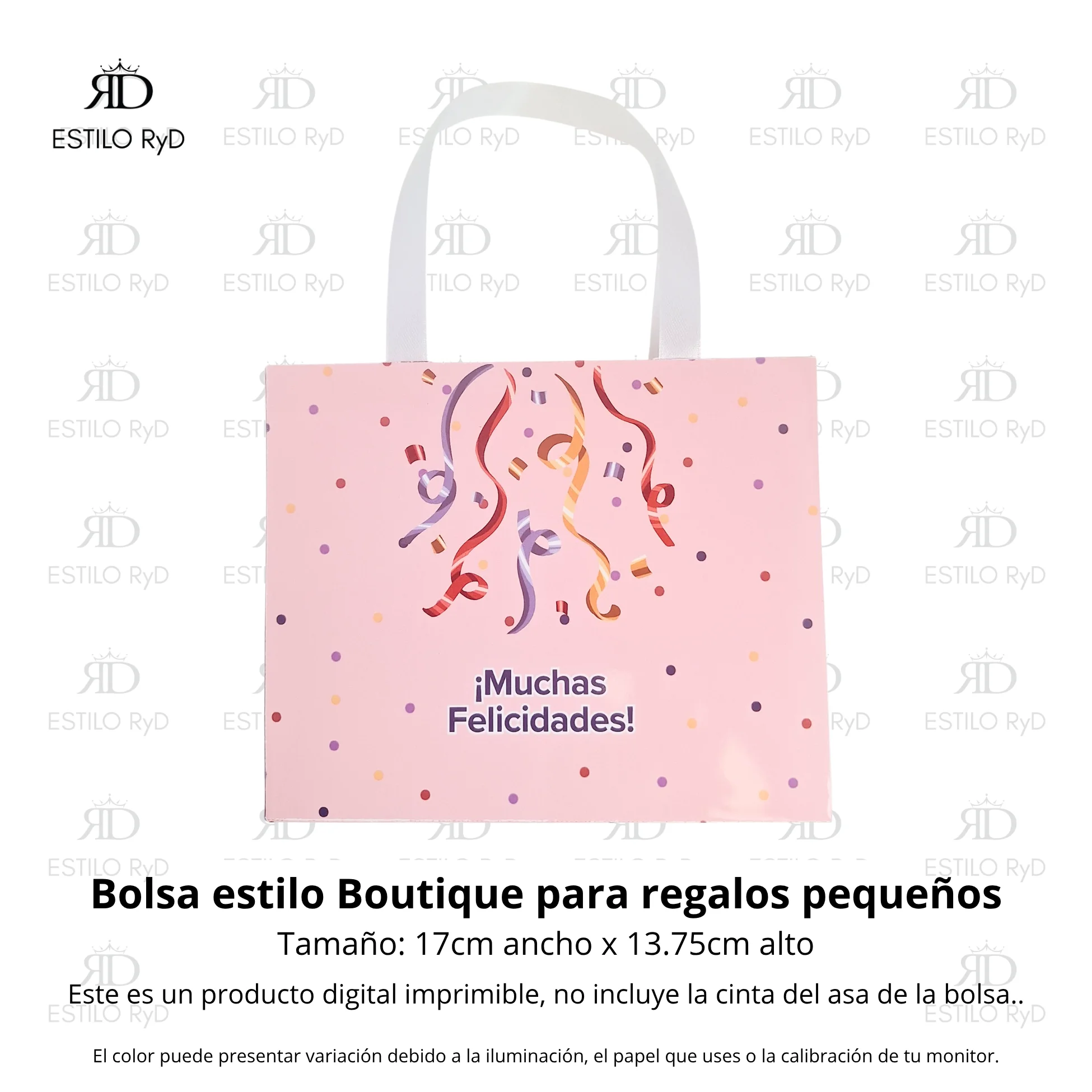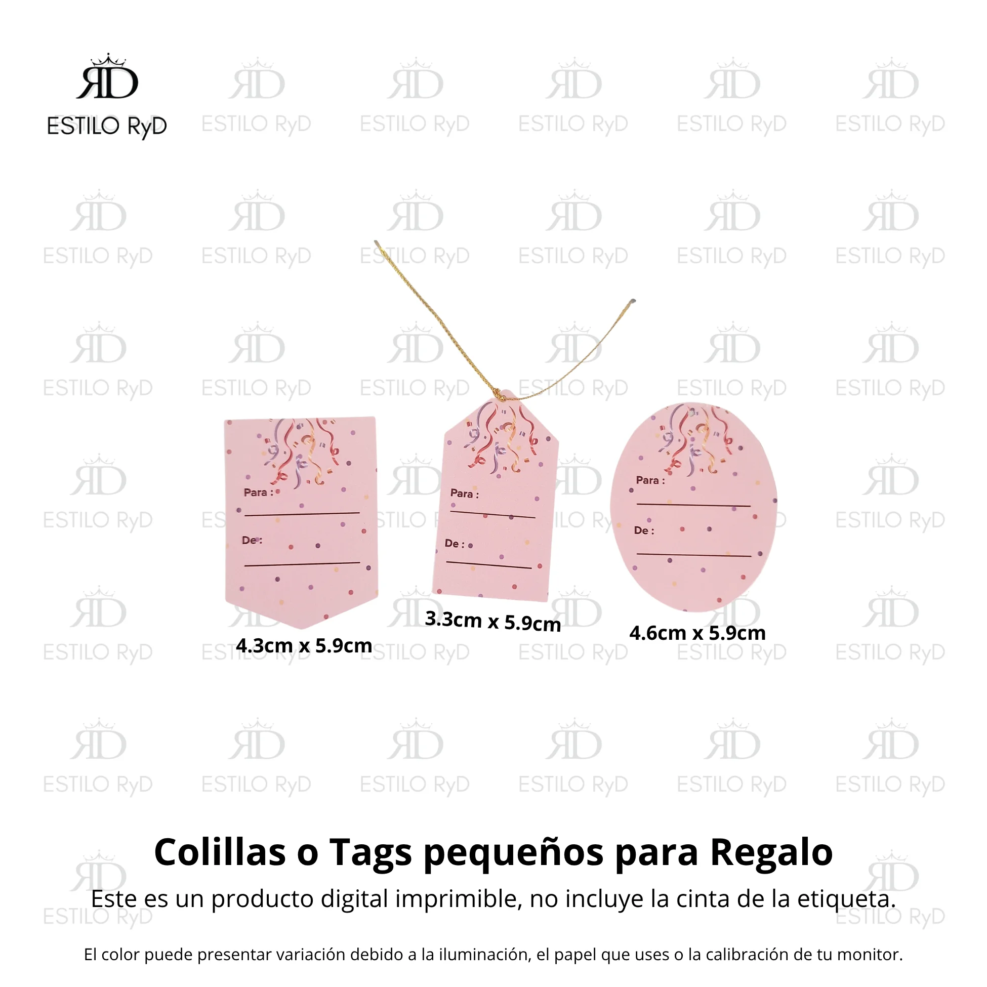 Necesitas imprimir los diseños que deseas del .pdf y para obtener el producto terminado vas a necesitar: tijeras / cutter / bisturí o exacto, goma / pegamento / cinta doble cara, cinta raso para las asas de las bolsitas y el hilo de preferencia para los Tags o Colillas para regalo.